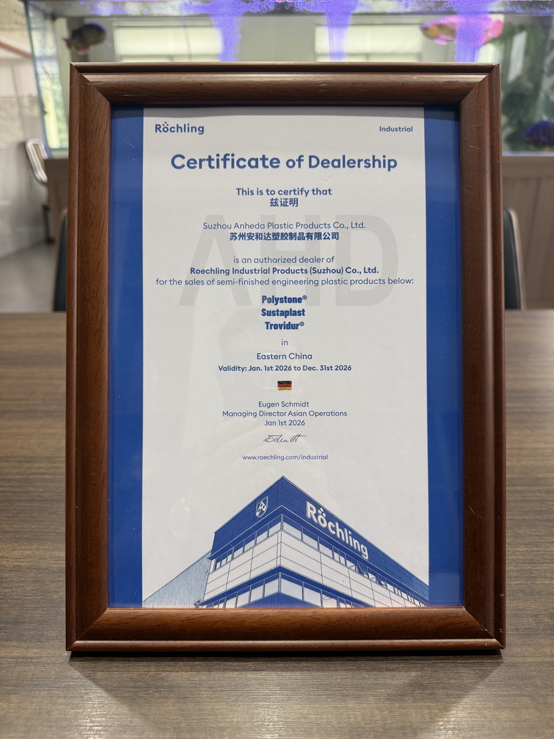近日,安和达塑胶苏州分公司正式获得德国劳士领(Röchling)授予的 2026 年度授权经销商资质,负责 Polystone®、Sustaplast、Trovidur® 等半制成工程塑料制品的销售业务,授权有效期自 2026 年 1 月 1 日至 12 月 31 日。